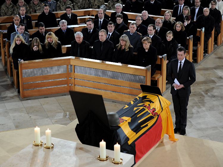 Merkel ergriff während der Zeremonie in der Pfarrkirche nicht das Wort. Zusammen mit Guttenberg verneigte sie sich vor den mit einer schwarz-rot-goldenen Flagge bedeckten Särgen.