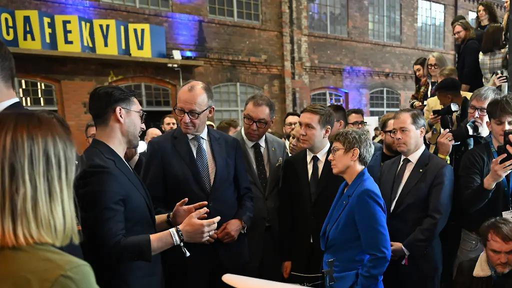 Einer von ihnen ist Bundeskanzler Friedrich Merz. Am Vormittag betritt der CDU-Chef den Kinosaal Nummer 10, wo bereits die neue Chefin der Konrad-Adenauer-Stiftung, Annegret Kramp-Karrenbauer, und der ukrainische Botschafter Oleksij Makejew gesprochen haben. Es ist das erste Mal, das ein Bundeskanzler das "Café Kyiv" eröffnet.