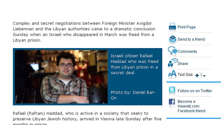 Hadad wurde in einem Privatflugzeug von Schlaff nach Wien geflogen, wo ihn Lieberman persönlich auf dem Flughafen empfing. Hadad, ein auf der Insel Dscherba geborener Israeli mit zusätzlicher tunesischer Staatsbürgerschaft, der heute in Jerusalem lebt, war im März nach Libyen geflogen, um dort das jüdische Erbe fotografisch zu dokumentieren. Als er ein jüdisches Gebäude ablichtete, wurde er von lokalen Polizeikräften als mutmaßlicher Spion verhaftet. Wie der israelische Rundfunk berichtete, sei Hadad in Libyen seitdem "verschollen". Amerikaner, Franzosen und Italiener hätten erfolglos versucht, das Schicksal Hadads in Libyen zu erkunden. In Israel selbst wurde das Verschwinden dieses israelischen Bürgers streng geheim gehalten. "Wir wurden gebeten, darüber nicht zu berichten", sagte ein Rundfunkmoderator. Die Zeitung Haaretz bestätigte, dass das Verschwinden von Hadad seit März einer "vollständigen Zensur" unterlag.