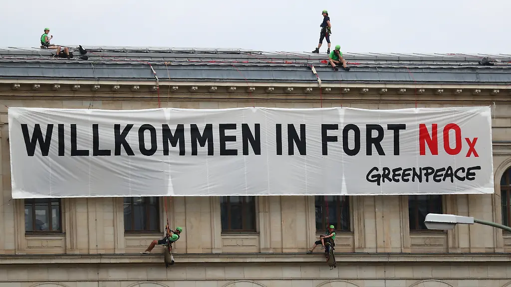 Die Aktivisten hatten schon vor Beginn des Dieselgipfels ein großes Transparent mit der Aufschrift "Willkommen in Fort NOx" vom Dach des Verkehrsministeriums entrollt - eine Anspielung an den zu hohen Ausstoß von Stickoxiden (NOx) bei Diesel-Fahrzeugen.
