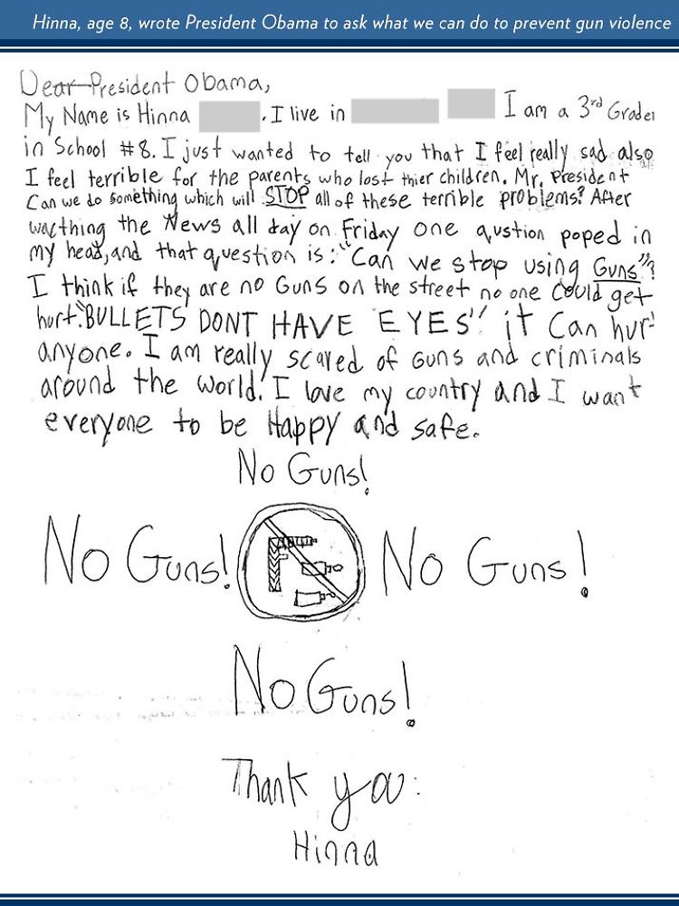 Bei dem emotionalen Auftritt waren auch Angehörige der Toten dabei. Auch Kinder waren anwesend, die dem Präsidenten nach dem Amoklauf geschrieben hatten. Zu Beginn seiner Rede las Obama aus ihren Briefen vor. Einen der Briefe veröffentlichte das Weiße Haus auf Facebook. "Wenn es keine Waffen gibt, kann auch niemandem weh getan werden", schreibt die Drittklässlerin Hinna darin. "Kugeln haben keine Augen – sie können jeden verletzen. Ich habe Angst vor Waffen und Kriminellen."