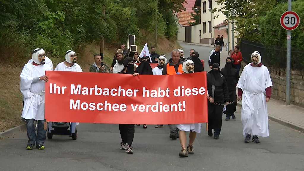 Gegner des umstrittenen Moscheebaus in Erfurt, einige vermummt und in Arabisch anmutenden Gewändern, sind am Morgen durch den Erfurter Ortsteil Marbach gezogen. Sie trugen ein großes schwarzes Kreuz und Transparente mit Aufschriften wie: "Ihr Marbacher habt diese Moschee verdient" und "Ich bin gesandt worden, das Kreuz zu brechen, das Schwein zu vernichten". Die Polizei sprach von weniger als 20 Teilnehmern. Der Aufzug sei genehmigt gewesen.