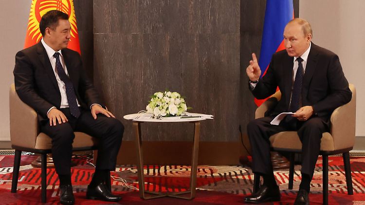 Kirgisitans Präsident Sadyr Dschaparow (l) in Samarkand mit Russlands Präsident Wladimir Putin.