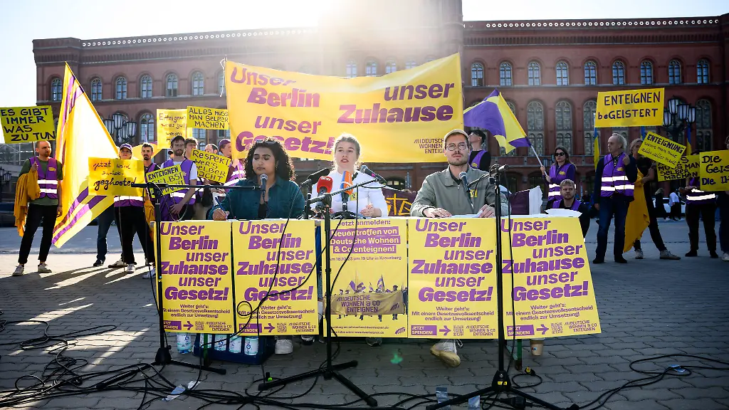Zwei Jahre nach ihrem erfolgreichen Volksentscheid hat die Berliner Initiative "Deutsche Wohnen & Co enteignen" einen zweiten Anlauf zur Vergesellschaftung großer Wohnungsunternehmen angekündigt. Diesmal will sie die Berliner gleich über ein Vergesellschaftungs-Gesetz abstimmen lassen, wie Vertreter der Initiative vor dem Roten Rathaus bekanntgaben. Damit soll verhindert werden, dass der Senat die Umsetzung des Anliegens verzögert. Genau das hat die Initiative der Landespolitik bisher immer wieder vorgeworfen.