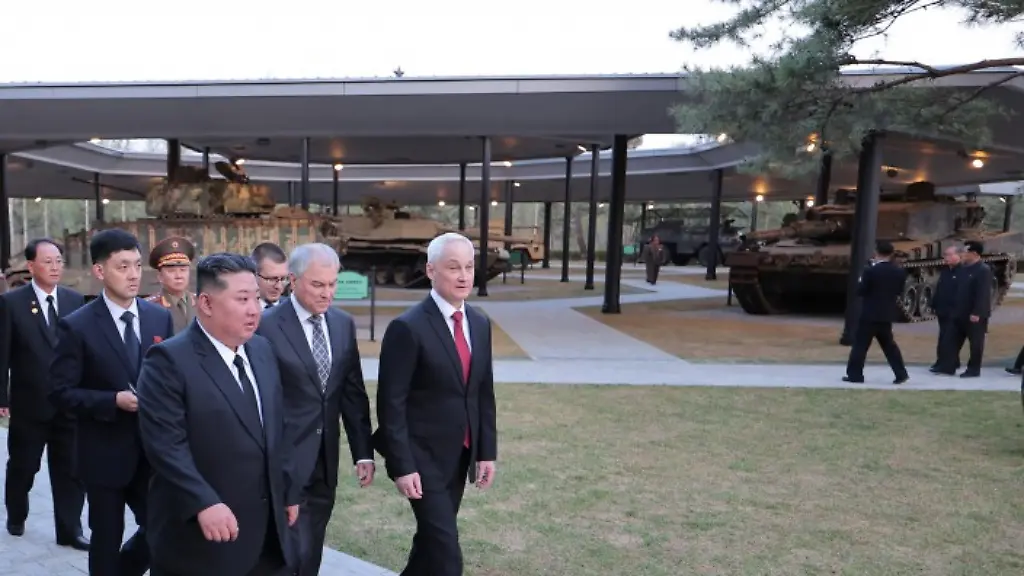 Bei der Einweihung des Museums begutachtete Diktator Kim Jong Un die ausgestellten Exponate mit Wjatscheslaw Wolodin, dem Vorsitzenden der russischen Staatsduma, sowie Verteidigungsminister Andrej Beloussow. Ein in russischen Medien verbreitetes Bild zeigt die drei, wie sie an einem Leopard-Kampfpanzer entlanggehen. Die Verifizierung von ntv.de stuft die Aufnahmen als authentisch ein.