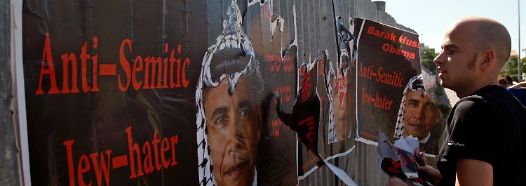 In der Frage der Siedlungspolitik ging Netanjahu nicht auf Forderungen von Obama ein. (Ein Israeli reißt in Jerusalem Plakate ab, auf denen Obama als "Antisemit" und "Judenhasser" diffamiert wird.)