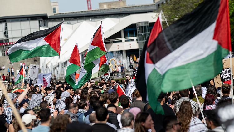 Die Veranstalter hatten nach Polizeiangaben eine Demonstration mit 1500 Menschen gegen das Verbot des Kongresses angemeldet. Die Polizei zählte in der Spitze 1900 Teilnehmerinnen und Teilnehmer. Auf der Demonstration waren Parolen zu hören wie "Viva, viva Palästina", "Palästina will never die" oder "Israel bombardiert - Deutschland finanziert". Unweit der Demo protestierte eine kleine Gruppe von Menschen mit Israel-Flaggen.