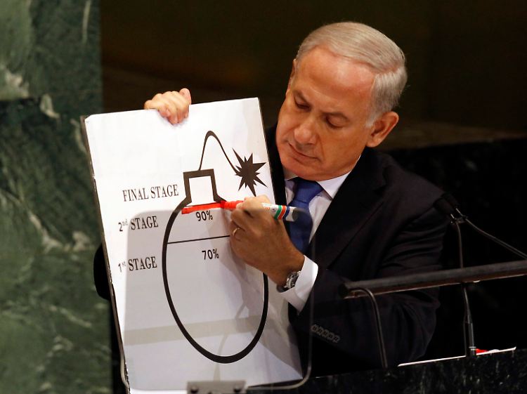 Israels Ministerpräsident ging in seiner Rede vor der Vollversammlung nur am Rande auf den Konflikt mit den Palästinensern ein. Er widmete sich vor allem dem Iran und verglich den Staat mit der Terrororganisation Al Kaida. mit militärischen Schritten, weil es befürchtet, dass Teheran heimlich Atomwaffen entwickelt. Netanjahu sagte: "Es macht keinen großen Unterschied, ob sich diese Waffen in den Händen der gefährlichsten terroristischen Organisation oder des gefährlichsten terroristischen Regimes befinden." Es gehe um das "Überleben seines Landes". Vor diesem Hintergrund forderte Netanjahu von der internationalen Gemeinschaft eine "rote Linie" gegen das iranische Atomprogramm. "Rote Linien führen nicht zum Krieg. Rote Linien halten vom Krieg ab", sagte er.