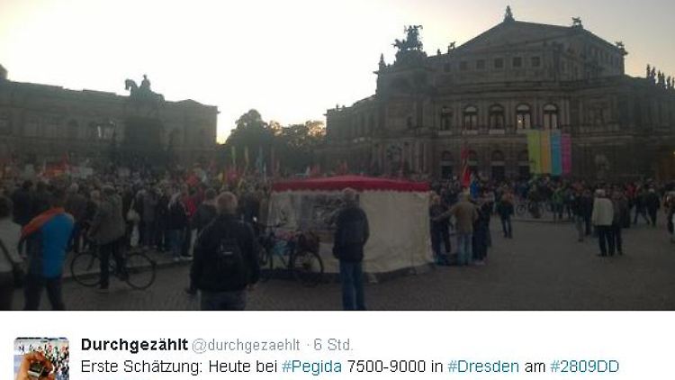 Das Bündnis verzeichnete kurz vor dem ersten Jahrestag seiner Gründung Mitte Oktober am Montagabend erneut Zulauf. Nach Schätzungen der Gruppe Durchgezählt im Anschluss an den Demonstrationszug durch die Dresdner Altstadt lag die Teilnehmerzahl zwischen 7000 und 8500. dpa-Reporter waren bei der Auftaktkundgebung zunächst von etwa 10.000 Pegida-Anhängern auf dem Theaterplatz vor der Semperoper ausgegangen. Polizei und Stadt erheben zwar noch Zahlen, geben diese aber schon seit Monaten nicht mehr an die Öffentlichkeit.