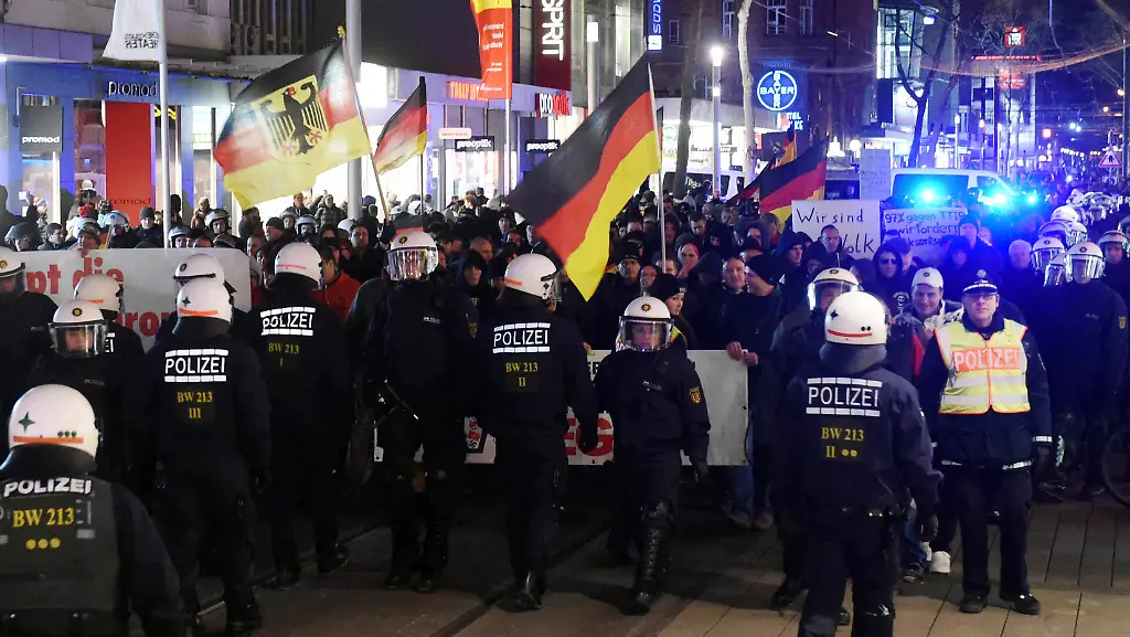 Die Versammlung sei aber "größtenteils friedlich" gewesen, berichtete die Polizei. Unter den Demonstranten gab es den Angaben zufolge keine Verletzten. In der Karlsruher Innenstadt demonstrierten zeitweise etwa 200 Anhänger von Pegida-Karlsruhe mit schwarz-rot-goldenen Fahnen. Zeitgleich versammelten sich unterdessen insgesamt etwa 700 Gegner der Bewegung "Karlsruher gegen die Islamisierung des Abendlands" (Kargida) im Stadtzentrum.