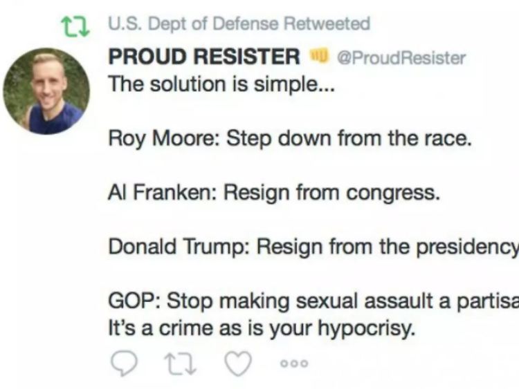 Dass allerdings das Pentagon eine Rücktrittforderung weiterverbreitet - das ist neu. Was war passiert? In der Twitterbotschaft schreibt der Nutzer Proud Resister: "Die Lösung ist einfach: Roy Moore: Zieh' Dich aus dem Rennen zurück. Al Franken: Scheide aus dem Kongress aus. Donald Trump: Leg' das Präsidentenamt nieder!" Zur Erklärung: Gegen den republikanischen Senatskandidaten Roy Moore und den demokratischen Senator Al Franken gibt es derzeit Belästigungsvorwürfe. Auch gegen Trump gab es in der Vergangenheit Anschuldigungen.