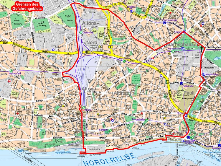 Die Polizei in Hamburg darf ab sofort in einem großen Teil der Stadt nach eigenem Ermessen Personenkontrollen vornehmen und Passanten "aus der Anonymität" holen. Sie richtete ein "Gefahrengebiet" ein, das fast komplett die Stadtteile St. Pauli und Altona sowie den Süden des Stadtteils Sternschanze umfasst. Laut Polizei-Mitteilung sollen damit Straftaten verhindert werden. Ohne Verdacht können die Beamten nun Menschen durchsuchen, sie in Gewahrsam nehmen und Platzverweise erteilen. Am Nachmittag soll es damit losgehen. Zwei Hundertschaften würden dann "relevante Personengruppen" einschließlich ihrer mitgeführten Sachen überprüfen, sagte ein Polizeisprecher. Wie lange die Stadtteile Gefahrengebiet bleiben, sei von der weiteren Entwicklung abhängig.