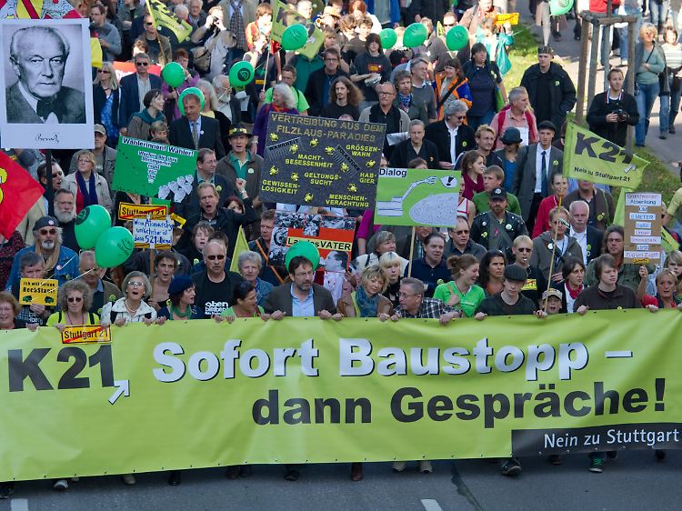 Etwa 55.000 Menschen hatten nach Schätzungen der Polizei am Samstag erneut gegen das Bahnprojekt Stuttgart 21 in der baden-württembergischen Landeshauptstadt protestiert. Die Veranstalter sprachen von 90.000 bis 100.000 Teilnehmern. Friedlich und lautstark forderten sie "Oben bleiben!" und "Mappus weg!". Die Demonstration stand unter dem Motto "Sofort Baustopp - dann Gespräche!". Dass mit dem früheren CDU-Generalsekretär Heiner Geißler ein Vermittler gefunden wurde, erfüllt einige Abrissgegner mit Hoffnung.