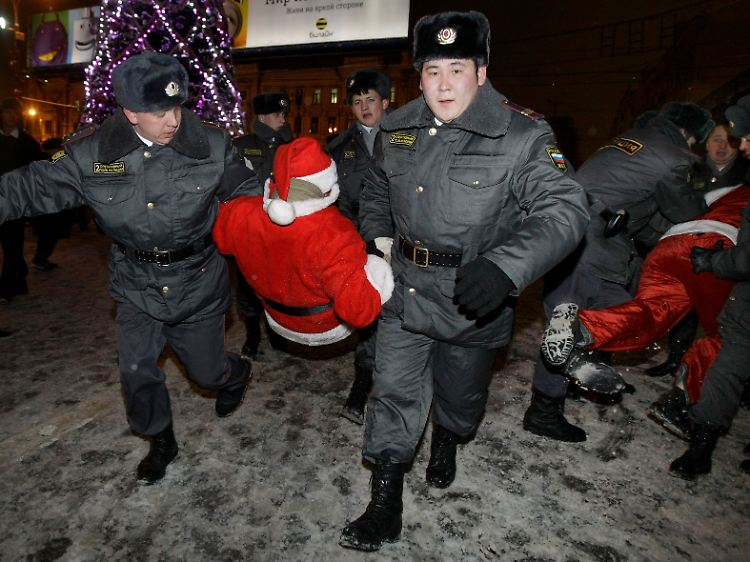 Auch andere Demonstranten, die als Väterchen Frost bzw. Snegurotschka angezogen sind, werden in Gewahrsam genommen.