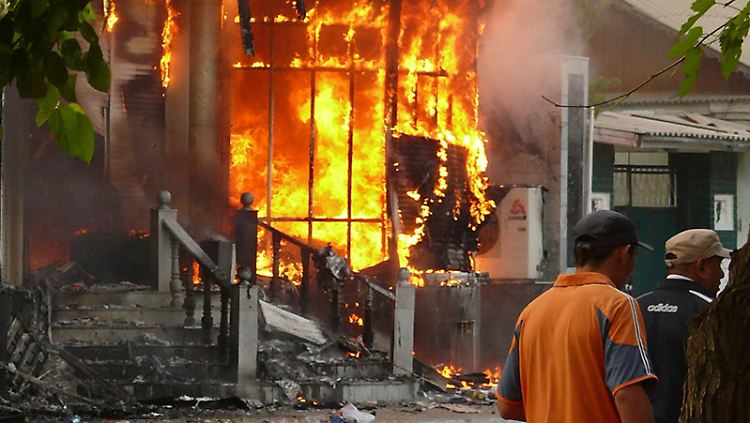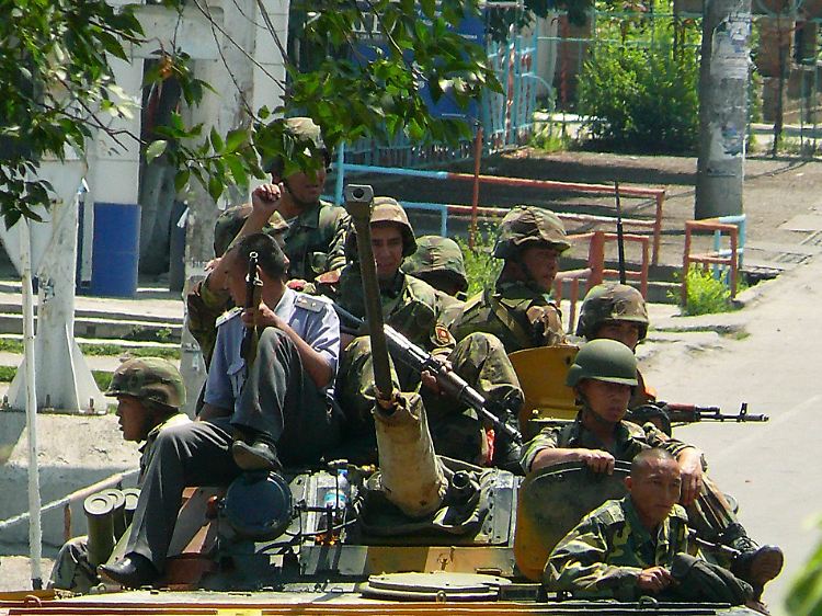 In Teilen von Osch brannten Dutzende Häuser, darunter Geschäfte, Kultureinrichtungen und Internetcafes, sowie zahlreiche Autos. Über der Stadt stiegen schwarze Rauchwolken auf, wie eine Augenzeugin sagte. Mit Panzern, Hubschraubern und Schüssen in die Luft versuchten Militär und Polizei, die Lage unter Kontrolle zu bekommen. Nach Schätzungen der Polizei waren mehrere tausend Menschen an den blutigen Ausschreitungen beteiligt.