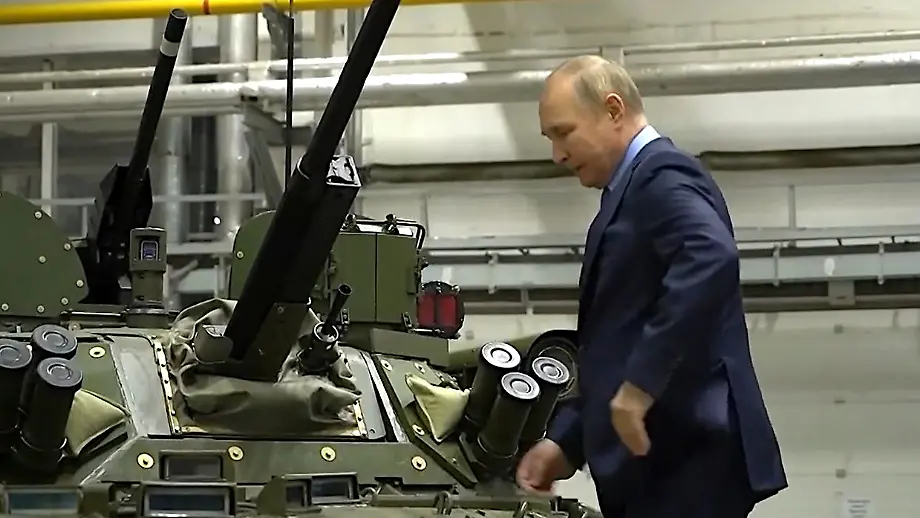 In einer Werkshalle kletterte Putin auf einen auf Hochglanz polierten Panzer, wie ein Video zeigt. Der russische Präsident nutzte dafür ein bereitstehendes Treppchen und hielt sehr auffällig eine Hand in der Anzugtasche. Seine Inspektion des Panzers wirkte hastig und fahrig. Putin forderte, bei der Produktion von Waffen die "bisherigen Kampferfahrungen" einfließen zu lassen. Er vermied jeden Hinweis darauf, wo diese "Kampferfahrungen" gesammelt wurden.