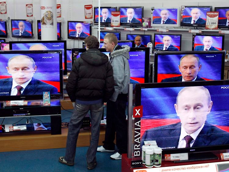 Während seiner TV-Ansprache ist Putin überall präsent: in Moskauer Elektronikläden ...