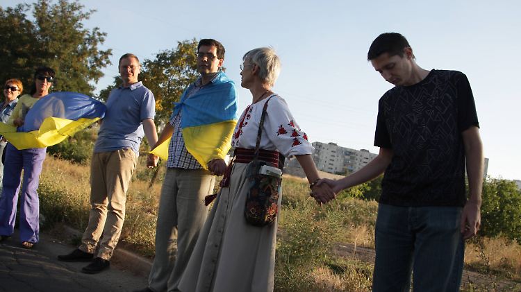 Bewohner von Mariupol bilden eine Menschenkette, um gegen den Krieg zu demonstrieren. Der Stadt steht offenbar ein Sturmangriff der Separatisten bevor.