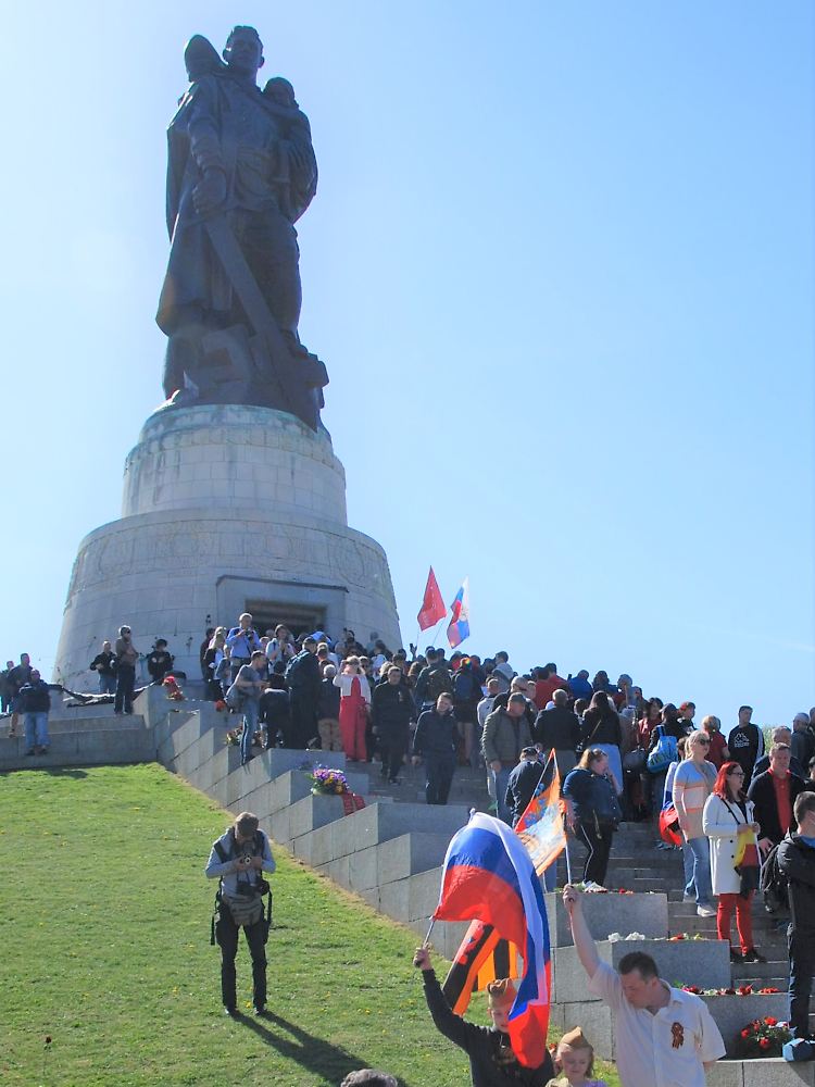 Am sowjetischen Ehrenmal im Osten Berlins sollen an diesem Montag, den 9. Mai, keine russischen Fahnen oder Flaggen wehen, das hat die Polizei so bestimmt. Doch am Vormittag flattert es gleich mehrfach blau-weiß-rot auf der steilen Treppe vor dem 30 Meter hohen Monument im Treptower Park, das so aussieht, als ob es eigentlich in Moskau stehen müsste und nicht in der bundesdeutschen Hauptstadt. Gerade hat der russische Botschafter hier einen Kranz niedergelegt und des Sieges der Sowjetunion über Hitler-Deutschland gedacht. Er und seine vielköpfige Delegation trugen alle das St.-Georgs-Kreuz am Revers, ein Ehren-Bändchen der Roten Armee, das mittlerweile auch als Putin-Bekenntnis gilt.