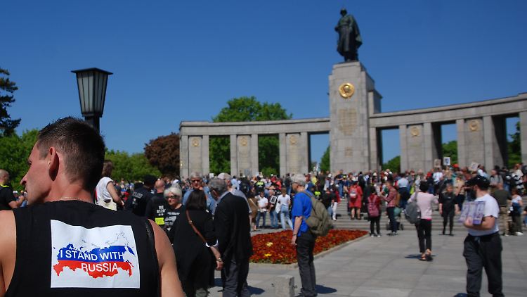 "Was sollen diese Fragen", ereifert sich eine Frau am Sowjetischen Ehrenmal an der Straße des 17. Juni. Eine Journalistin hat sie gerade nach Putin, der Ukraine und dem Krieg gefragt. "Das sind politische Fragen, heute ist ein Feiertag! Sehen Sie, ich habe hier nicht nur eine russische, sondern auch eine deutsche Fahne, denn ich bin Deutsche!" Eine andere Frau sagt, der Tag solle neutral sein, und weist einen Mann zurecht, der ein Käppi mit einem "Stop Putin"-Sticker in Blau-Gelb trägt. Ein anderer Mann ruft ihm "Provokateur" hinterher. Einem anderen jungen Mann wirft das niemand vor. Auf seinem T-Shirt-Rücken sind die Umrisse Russlands zu sehen und darunter heißt es: "I stand with Russia".