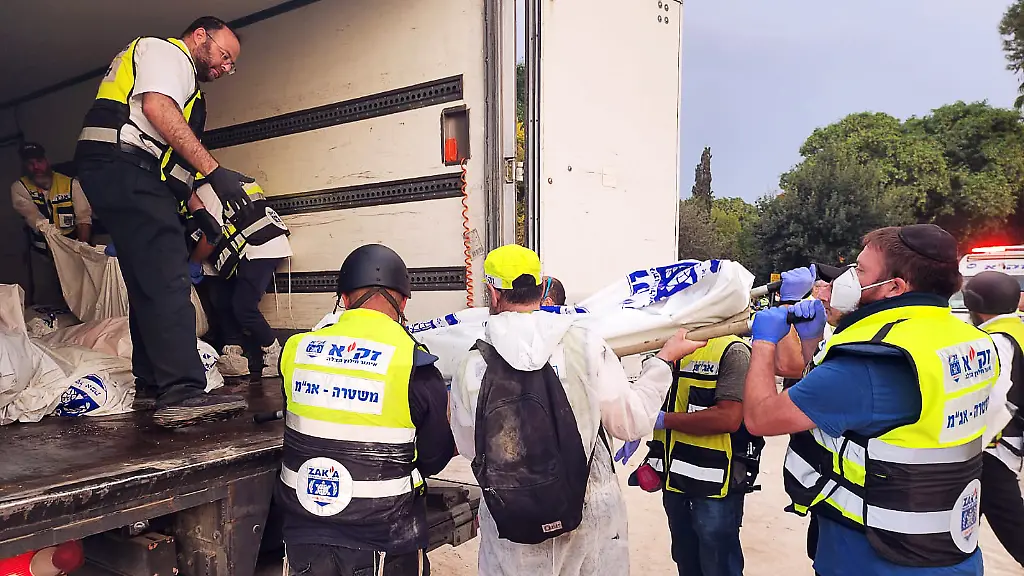 Nach dem Ende der Gefechte auf israelischem Territorium werden Hunderte Leichen von Rettungskräften geborgen. Die Helfer, eigentlich hartgesotten, kämpfen angesichts ihrer großen Zahl, mit den Nerven. "Es waren Lastwagen voller Leichen", sagt ein Freiwilliger des Rettungsdienstes Zaka.