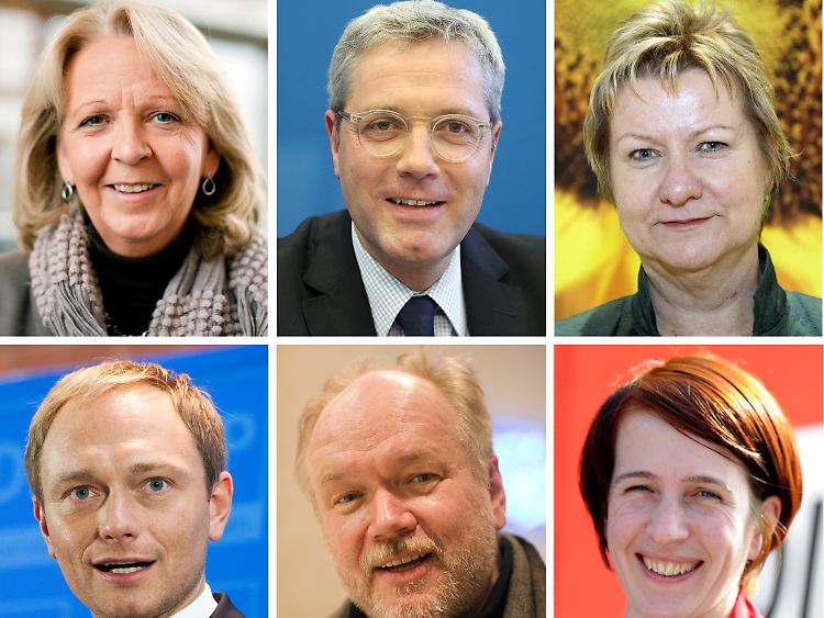 Die Spitzenkandidaten von SPD, CDU, Bündnis 90/Die Grünen, FDP, der Piratenpartei und der Linkspartei (l-r): Kraft, Röttgen, Löhrmann, Lindner, Paul und Schwabedissen.