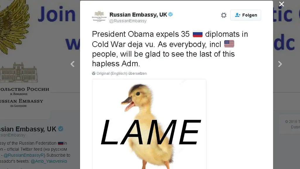 Die USA weisen Dutzende russische Diplomaten aus. Als Reaktion spottet Moskaus Vertretung in England mit ihrer Meinung über Präsident Obamas Amtszeit - und dem Bild eines Kükens.