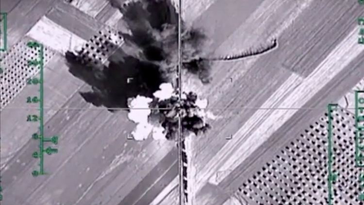 Ein Foto, das vom russischen Verteidigungsministerium veröffentlicht wurde: Angriff auf einen Lkw-Konvoi in Syrien, der nach russischen Angaben Waffen transportierte.