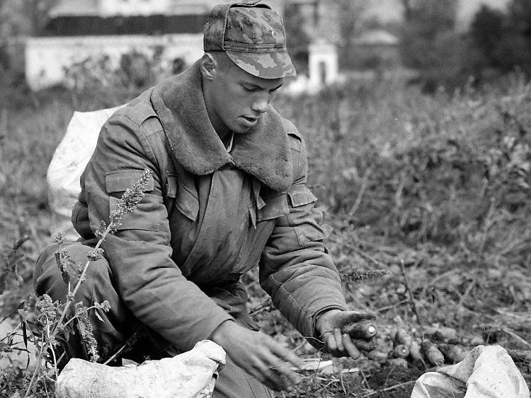 "Heldenhafter" Arbeitseinsatz: Ein russischer Soldat bei der Karottenernte.