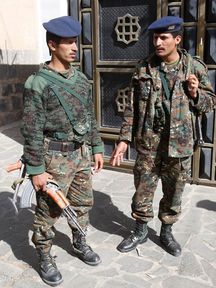 Vor dem Sicherheitsgericht in Jemens Hauptstadt Sanaa stehen zwei Polizisten. Hier wird in Abwesenheit gegen Anwar al-Awlaki verhandelt, der als Al-Kaida-Vordenker gilt.