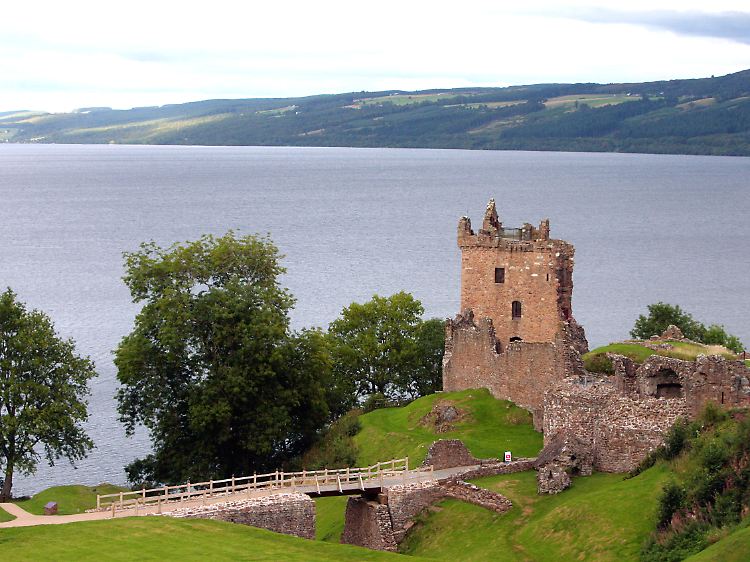 Blick auf Loch Ness. Im Vordergrund die Ruinen von Urquhard Castle aus dem 12. Jahrhundert, die auf einer Landzunge bei Drumnadrochit stehen.