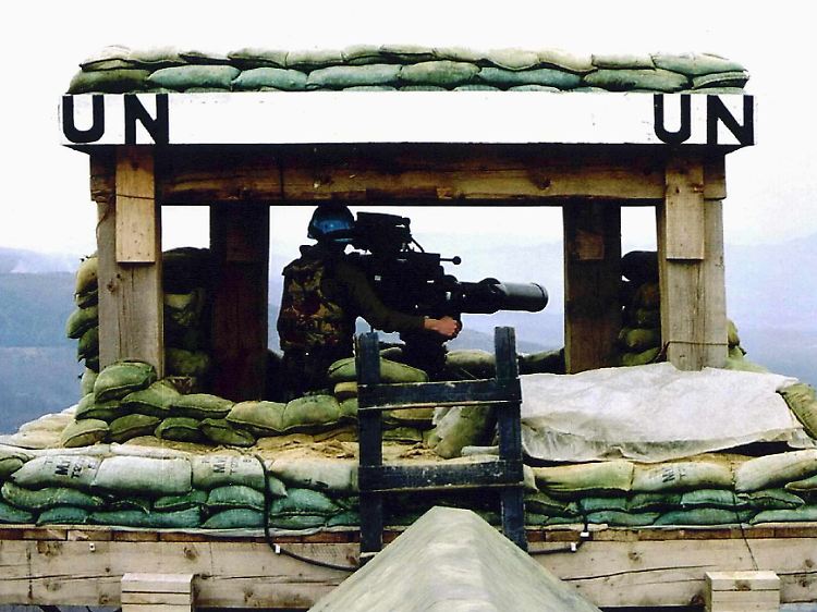Holländischer Blauhelmsoldat auf Posten in Srebrenica (10. Juli 1995).
