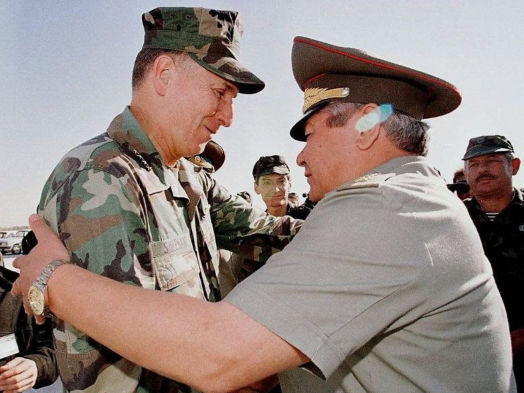 US-General John Sheehan (l.) wird von seinem kasachischen Kollegen, General Altinbajev, herzlich begrüßt (Archivbild von 1997).