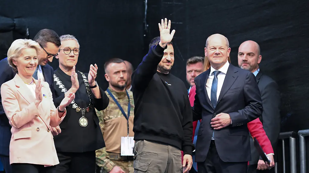 In Aachen wurden Selenskyj und mit ihm das ukrainische Volk für ihre Verdienste um die Einheit Europas mit dem Karlspreis ausgezeichnet. Scholz sagte in seiner Laudatio, die Preisverleihung sei Auftakt für das weitere Zusammenwachsen in Europa. EU-Kommissionspräsidentin Ursula von der Leyen sagte an Selenskyj gewandt: "Sie kämpfen buchstäblich für Freiheit, Menschlichkeit und Frieden." Auch der polnische Ministerpräsident Mateusz Morawiecki lobte Selenskyj als Verteidiger europäischer Werte.