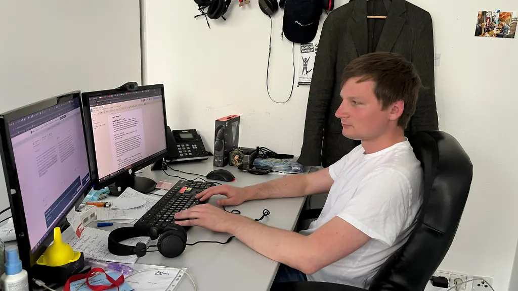 Ein schlanker, junger Mann im schwarzen Hemd hat den Blick fest auf seinen Laptop gerichtet. Ruslan Dergalov ist Chefredakteur dieses kleinen Senders. Er könnte auch ein Gamer sein - aber sein Game, das sind Nachrichten. Auf seinem Bildschirm sieht er aktuelle Meldungen, das Netzwerk X, Telegram, Nachrichtenseiten und seine Kontakte. Hauptsächlich von diesen Kontakten zehrt der Sender, der es sich zum Ziel gesetzt hat, russische Propaganda zu entlarven.