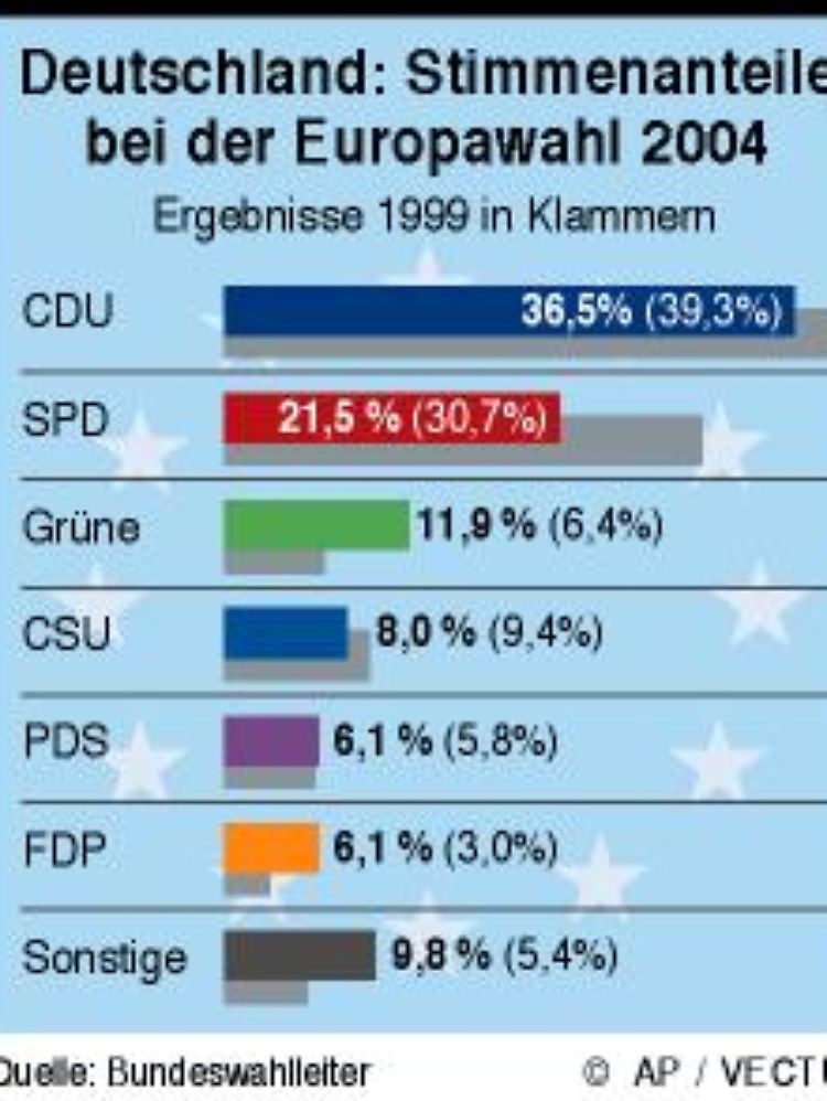 Ein Sieg der Union bei der Europawahl in einer Woche scheint trotz deutlicher Verluste nicht gefährdet zu sein. In Umfragen für die ARD und das ZDF kommen CDU und CSU zusammen auf 39 Prozent der Stimmen. Das wären zwar 5,5 Prozentpunkte weniger als bei der Europawahl 2004, die Union würde aber die SPD um mehr als zehn Prozentpunkte distanzieren.