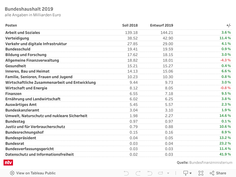 Gestützt auf eine rosige Kassenlage findet sich der Bundesfinanzminister in einer für sein Amt ungewöhnlichen Rolle wieder: Er kann großzügig Mittel verteilen. Der Regierungsentwurf zum Haushaltsplan 2019 sieht Mehrausgaben vor, die sich über fast alle Ressorts erstrecken. Die stärksten Zuwächse gibt es dabei in den Budgets von Verteidigungsministerin Ursula von der Leyen, von Umweltministerin Svenja Schulze und von Justizministerin Katarina Barley. Doch wofür genau gibt Deutschland welche Summen aus? Im kommenden Jahr sind folgende Verwendungszwecke vorgesehen: