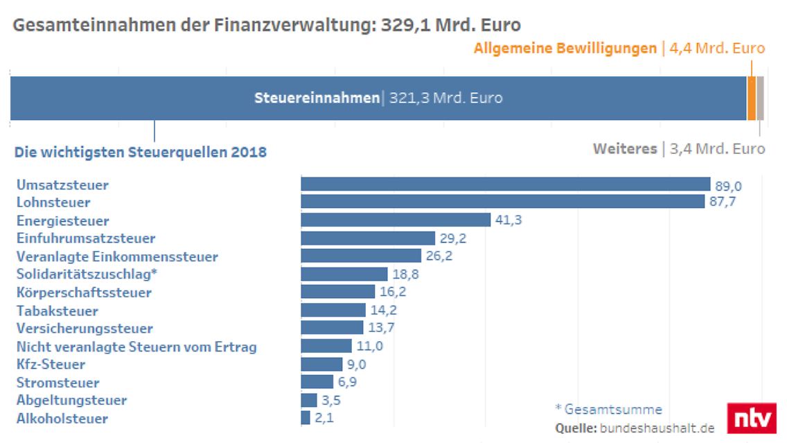 Insgesamt sollen sich die Einnahmen im laufenden Jahr laut Plan auf 343,6 Milliarden Euro belaufen. Die stärksten Beiträge erbringen die Umsatzsteuer mit gut 89 Milliarden Euro (Soll-Wert 2018), die Lohnsteuer mit 87,7 Milliarden Euro und die Energiesteuern, unter anderem auf Mineralöl, mit mehr als 40 Milliarden Euro. Ansehnliche Summen kommen auch mit der Tabaksteuer (14,1 Milliarden), der Versicherungssteuer (13,7 Milliarden), der KfZ-Steuer (9,0 Milliarden), der Alkoholsteuer (2,1 Milliarden) und nicht zuletzt mit dem Solidaritätszuschlag zusammen. Dabei will Scholz auch in diesem und in den kommenden Jahren ohne neue Schulden auskommen.