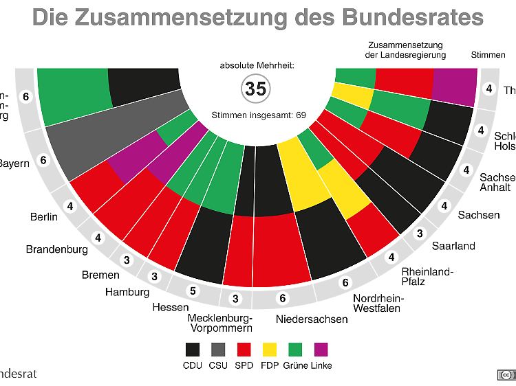 Damit kontrollierte die CSU im Kreis der 16 Bundesländer ebenso viele Stimmen wie das schwarz-grün regierte Baden-Württemberg oder das schwarz-gelb regierte Nordrhein-Westfalen - oder wie Bremen und Hamburg zusammen, die gemäß ihrer Einwohnerzahl jeweils nur auf drei der insgesamt 69 Stimmen im Bundesrat kommen. Die Bayernwahl dürfte das Stimmgewicht der Union im Bundesrat spürbar verringern: Der oder die künftigen Koalitionspartner in Bayern werden mit Sicherheit einen Teil der bayerischen Bundesratssitze beanspruchen.