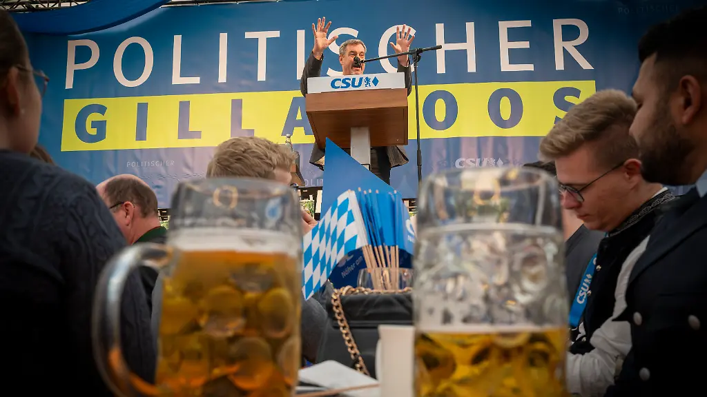 Angesichts des andauernden Umfragehochs der AfD hat CSU-Chef Markus Söder vor einer Regierungsverantwortung der Partei in der Zukunft gewarnt. "Lassen wir unser Land nicht auf den Leim gehen. Lassen wir unser Land nicht kaputtgehen. Ich sage Ihnen jetzt klar: Nein zu einer Übernahme Deutschlands und Bayerns durch die AfD", sagte der bayerische Ministerpräsident beim Gillamoos-Volksfest im niederbayerischen Abensberg. Generell sei die Freiheit in Deutschland "wackeliger denn je".