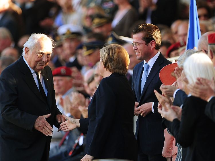 Bundeskanzlerin Merkel und Verteidigungsminister zu Guttenberg danken dem ehemaligen Wehrmachtsoffizier von Kleist für dessen Rede vor den Rekruten.
