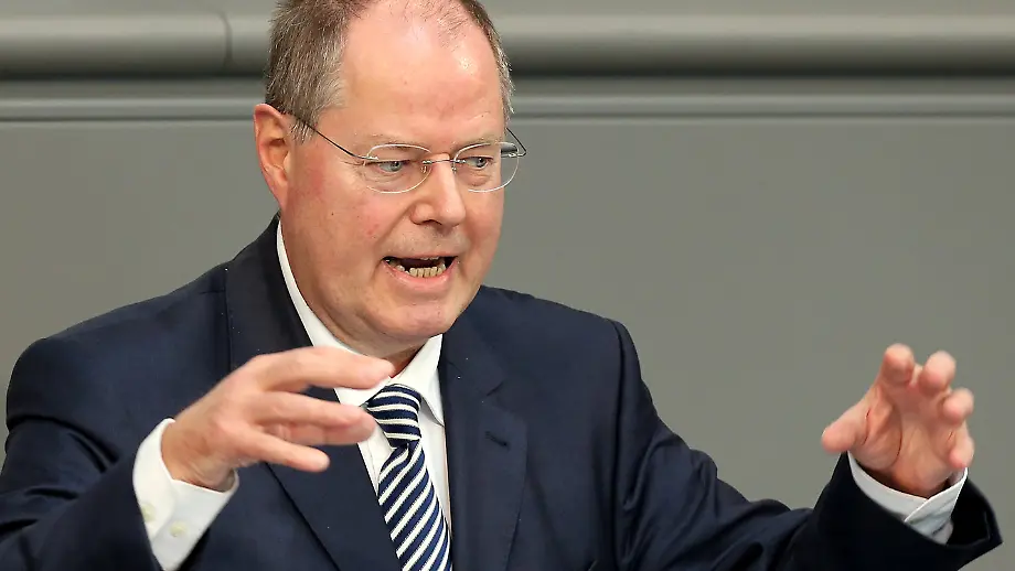 Der SPD-Kandidat hielt der Bundesregierung auch vor, zu wenig zur Ankurbelung des Wachstums zu unternehmen. "Aus einer einseitigen Krisenanalyse folgt eine einseitige Therapie: Sparen, sparen, sparen." Zugleich strenge sich die schwarz-gelbe Koalition zu wenig an, um das deutsche Haushaltsdefizit zu senken. Wörtlich sagte Steinbrück: "Vorsichtig formuliert: Es gibt von dieser Bundesregierung keine Vorreiterrolle beim Schuldenabbau in Europa."