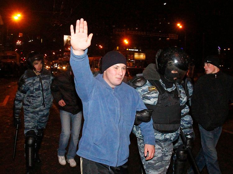 Aufgebrachte Jugendliche zogen durch die Straßen und feuerten Nebelkerzen und Feuerwerkskörper ab. "Russland für die Russen", "Moskau für die Russen", "Haut ab in den Kaukasus", skandierten Hunderte junge Männer und Frauen. Auch an anderen Orten in Moskau sowie in St. Petersburg und Samara kam es zu Protestmärschen sowie massenhaften Festnahmen. Dabei seien etliche Waffen beschlagnahmt worden, hieß es.