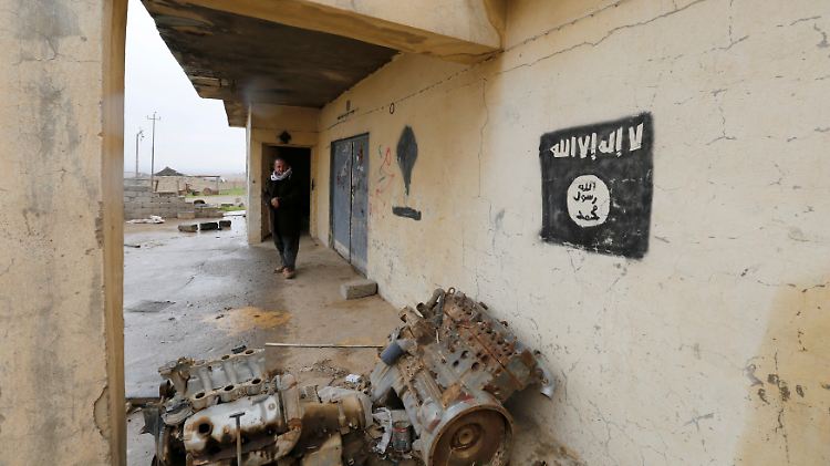 In der irakischen Stadt Karakosch hat jemand die schwarze Flagge des IS auf eine Häuserwand gesprüht.