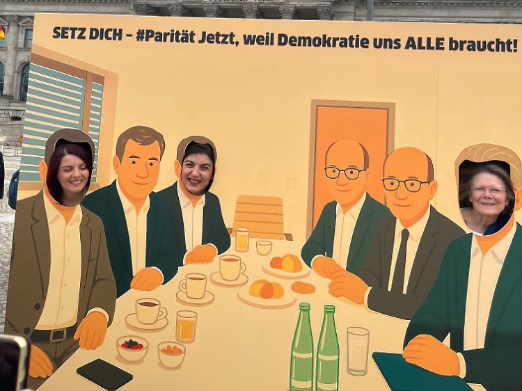 Die Initiative "#ParitätJetzt" will das ändern und nutzt deshalb Söders Männerrunde für ihren Aktionstag am Dienstag vor dem Reichstagsgebäude. 2,50 Meter hoch und 3 Meter breit prangt eine Nachzeichnung des Fotos auf einem Bannerschild, wobei die Köpfe von Thorsten Frei, Alexander Dobrindt und Martin Huber ausgeschnitten sind. Die Botschaft: Hier sollten die Köpfe von Frauen Platz haben. Das Bündnis, zu dem sich über 80 Organisationen zusammengeschlossen haben, fordert ein paritätisches Wahlrecht, das die Chancengleichheit von Frauenkandidaturen sichert und 50 Prozent Frauen in die Parlamente bringt.