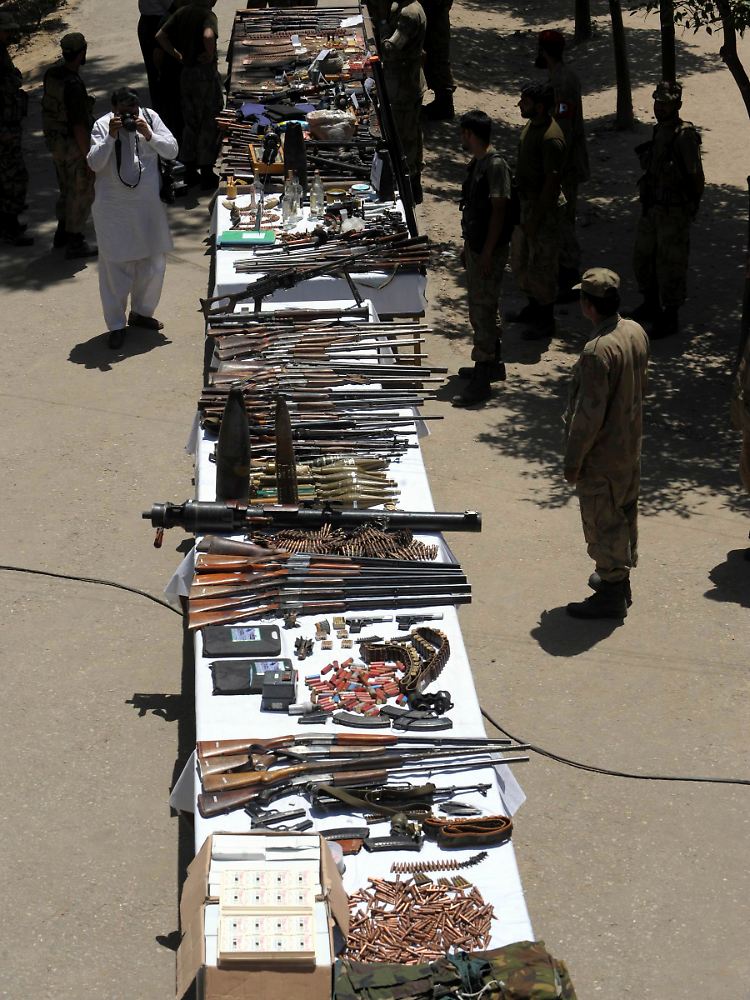 Soldaten zeigen waffen und Munition, die sie bei den Kämpfen gegen die Taliban erbeutet haben.