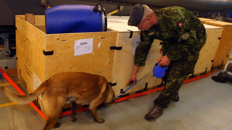 Auf einer dänischen Fregatte, die am Abtransport des syrischen Waffenmaterials beteiligt ist, trainiert ein Hund.