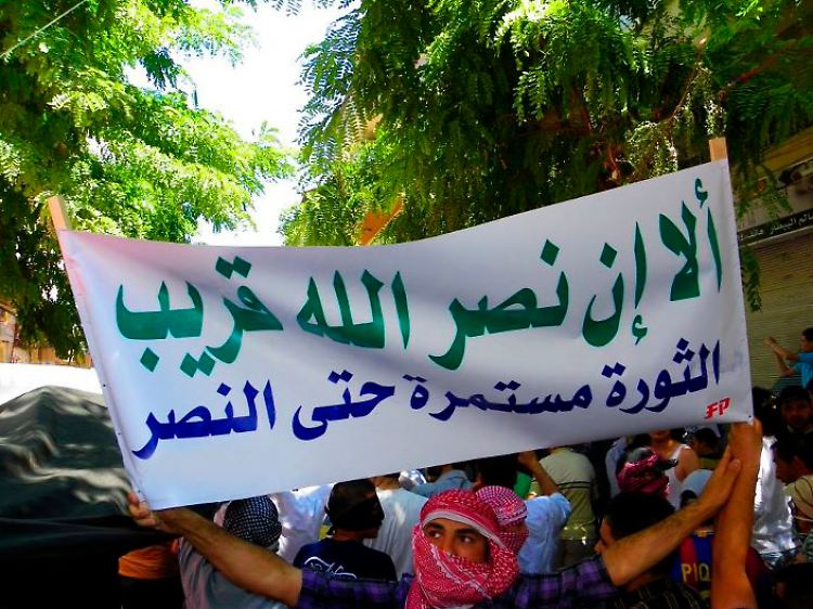 Demonstration gegen Assad in Homs am 30. Oktober. Auf dem Transparent steht: "Gottes Sieg naht, die Revolution geht weiter bis zum Sieg".