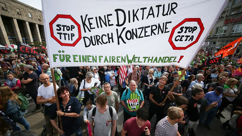 Aus Protest gegen die geplanten Handelsabkommen TTIP und Ceta sind in Deutschland mehr als 100.000 Menschen auf die Straße gegangen. Zwei Tage vor dem SPD-Konvent zum Ceta-Abkommen der EU mit Kanada machten sie ihrem Unmut mit bunten Plakaten, Luftballons und Trillerpfeifen Luft. Allerdings blieb die Zahl der Teilnehmer nach ersten Zählungen hinter den Erwartungen der Veranstalter zurück.