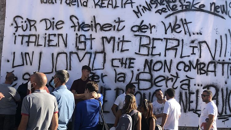 Die Polizei sprach vor Ort von geschätzt rund 2000 Menschen, darunter waren auch Schaulustige. Die Demonstranten knüpften auf Plakaten und in Reden ausdrücklich an die Proteste vor einer Woche in Berlin an. "Italien ist mit Berlin", stand auf einem Transparent. Auf einem Banner war zu lesen: "Noi siamo il popolo" (Wir sind das Volk), außerdem dass man gegen "big pharma" sei, also gegen Pharma-Riesen.
